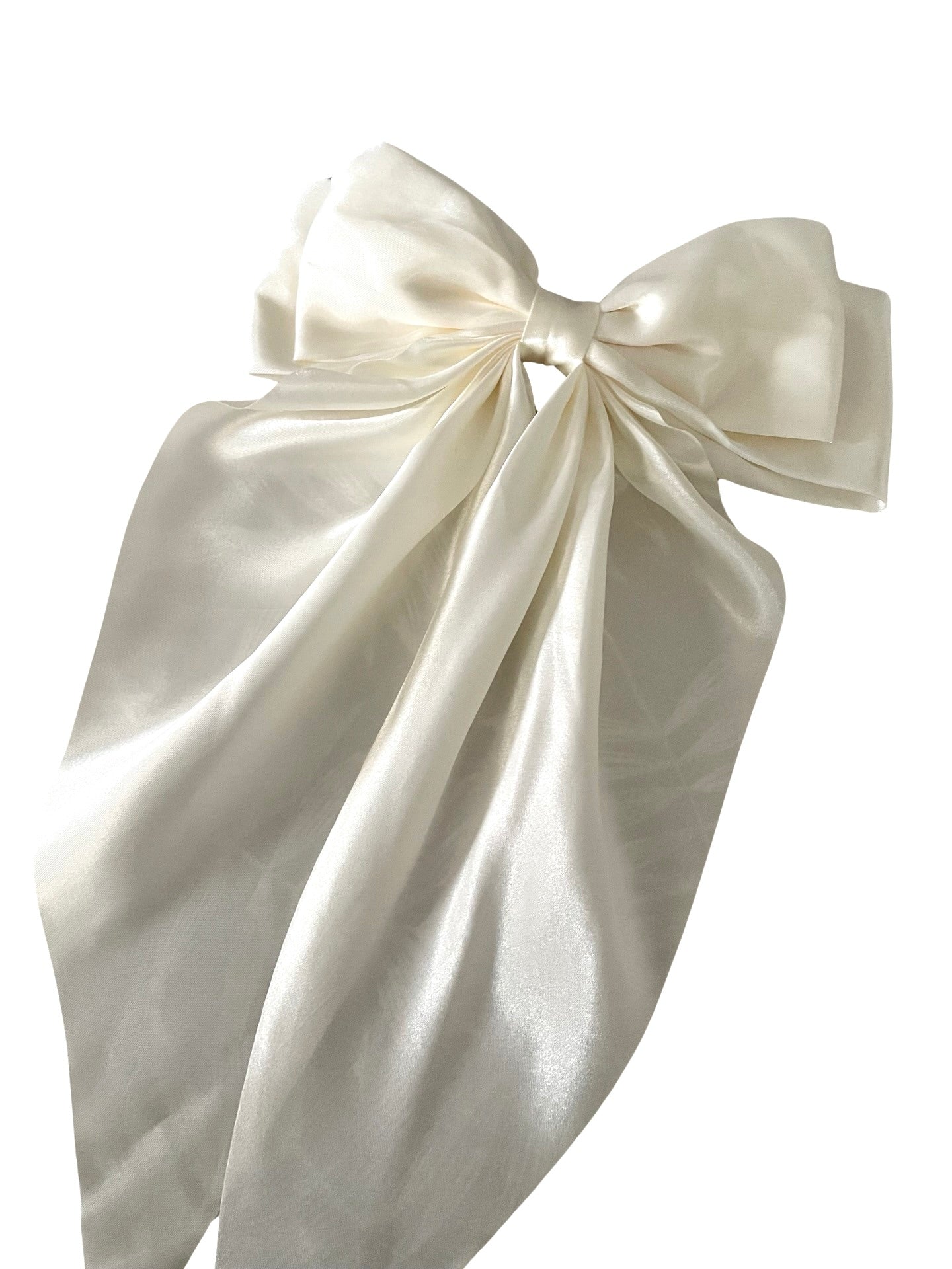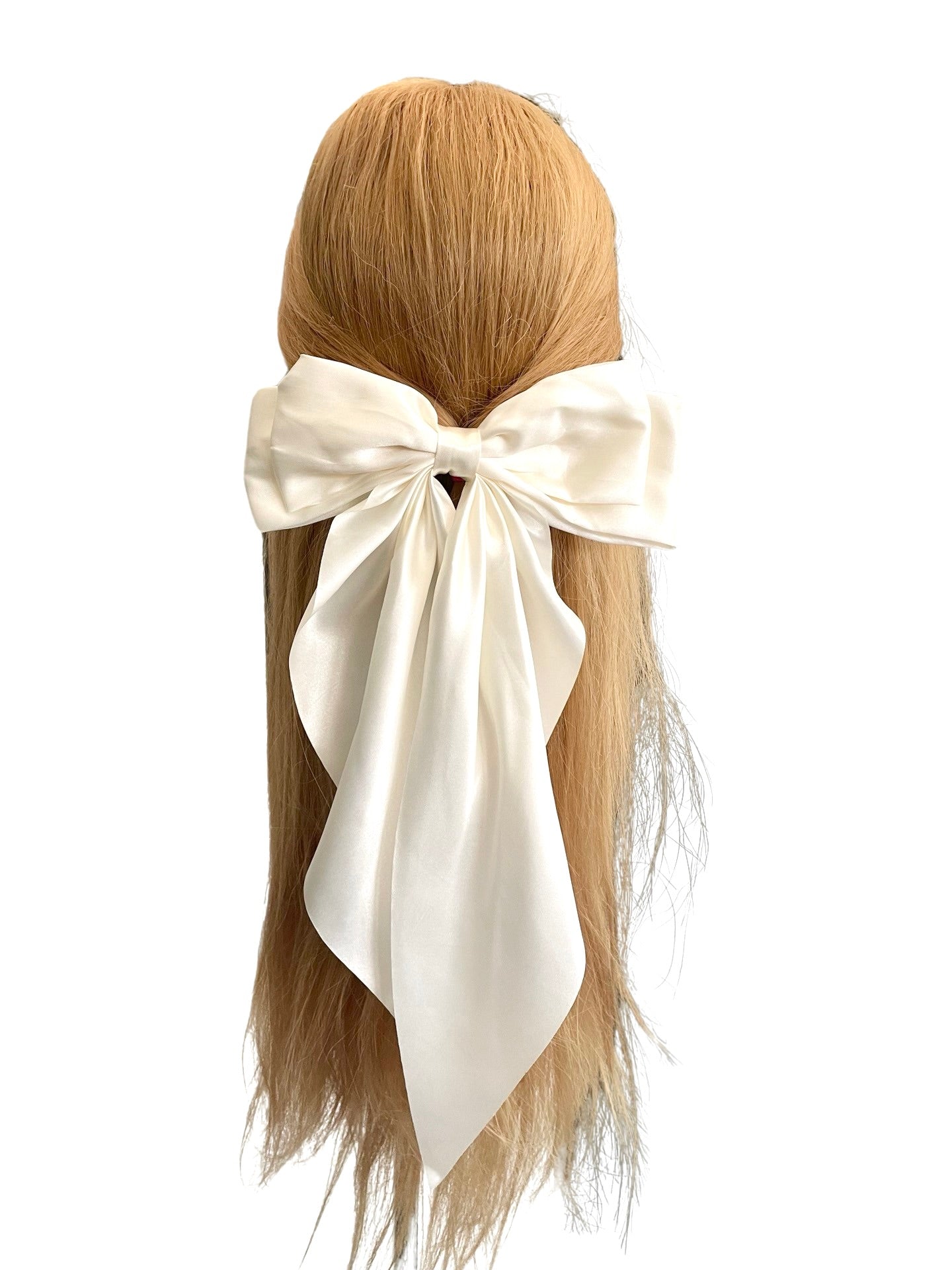 🖤 Elegant Champagne White Satin Long Tail Hair Bow Clip 🎀