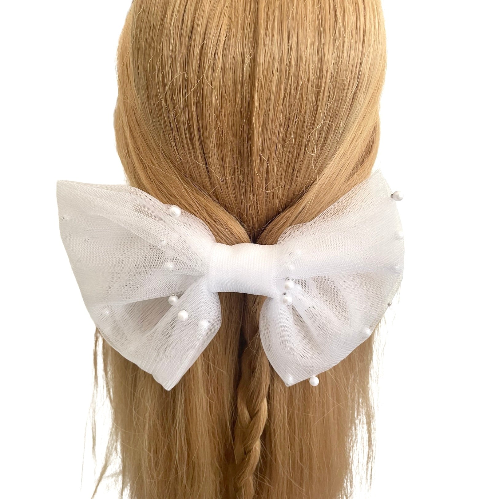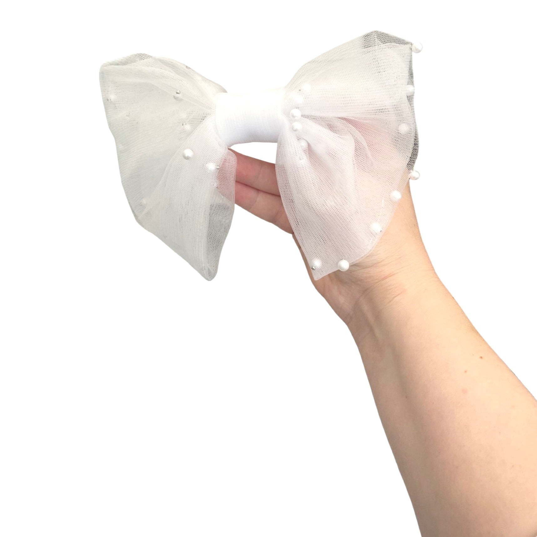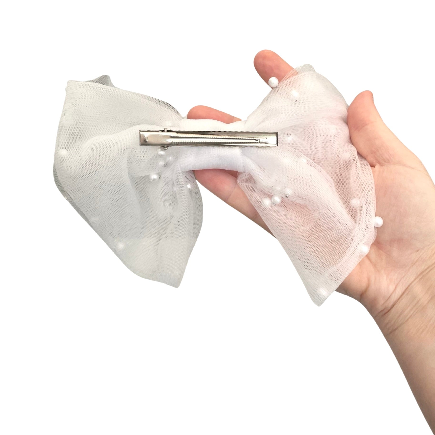 Versatile and easy to wear, our bridal pearl tulle hair bow complements a variety of hairstyles, whether you choose an updo, loose waves, or a classic bun. It securely fastens to your hair, allowing you to dance the night away without worrying about readjustments.