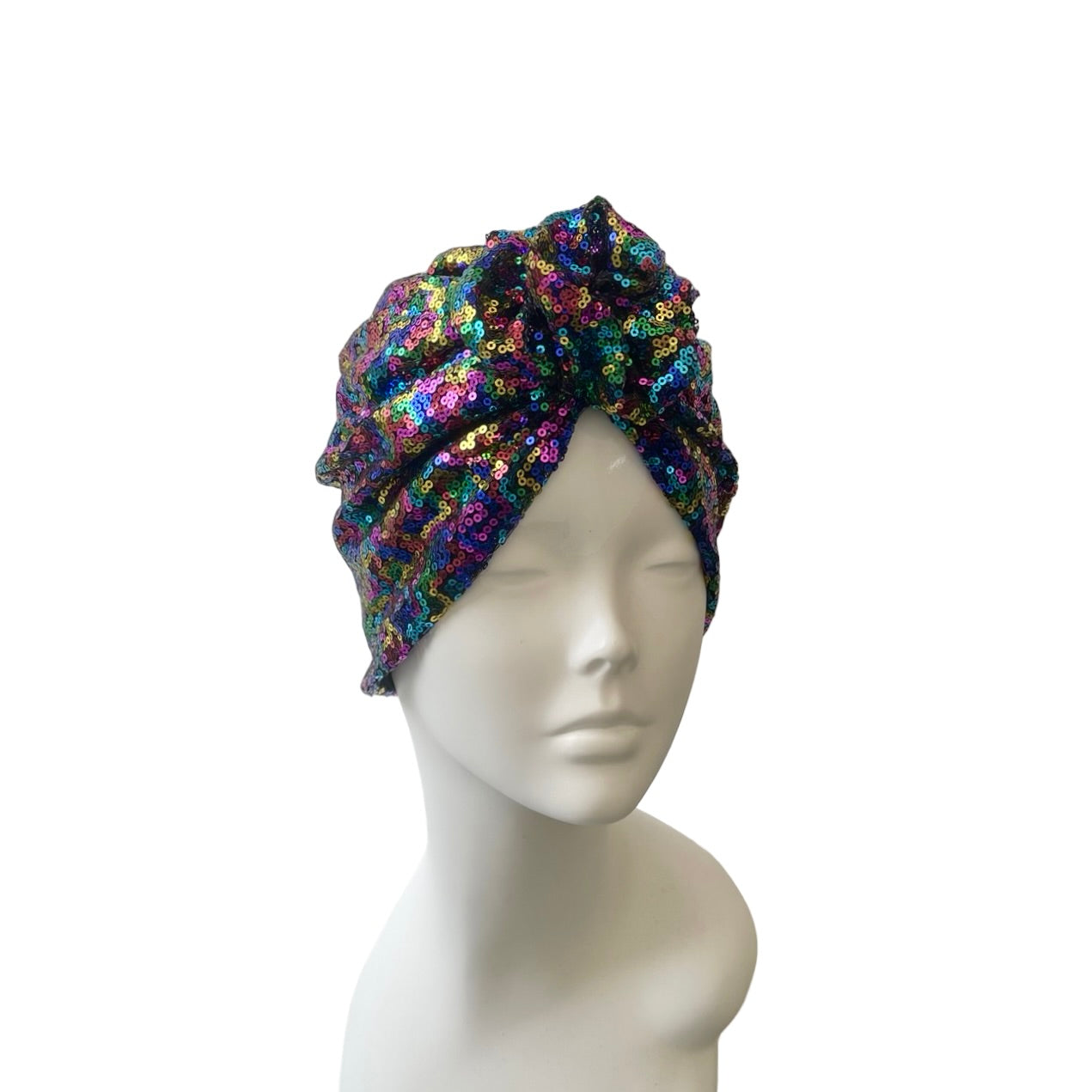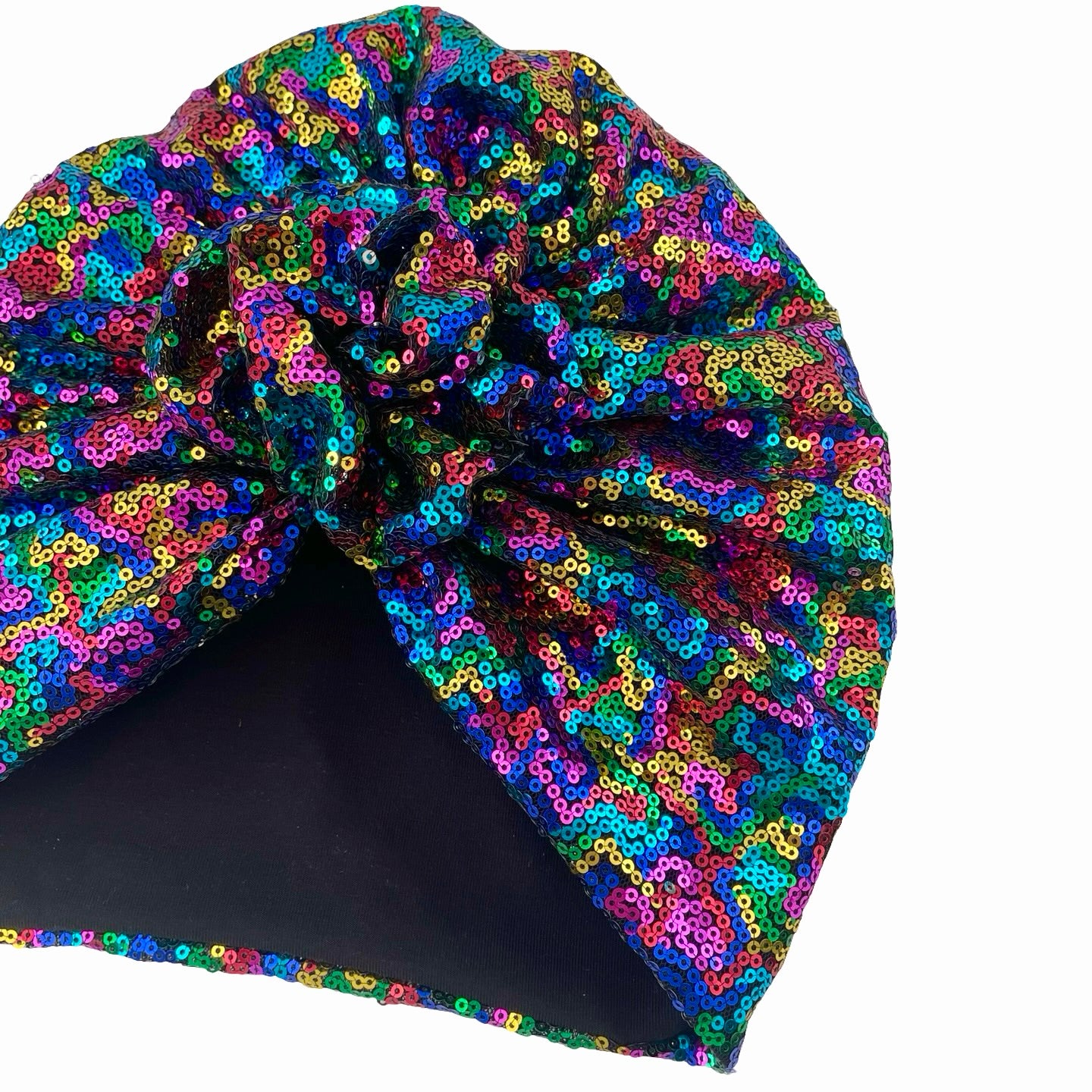 Introducing our colourful and sparkly rainbow sequin turban head wrap hat, the perfect accessory to add some glamour and sophistication to your look. Made with high-quality, stretchy fabric that is comfortable to wear, this turban head wrap is designed to provide full coverage to your head while also adding a touch of sparkle to your outfit.
