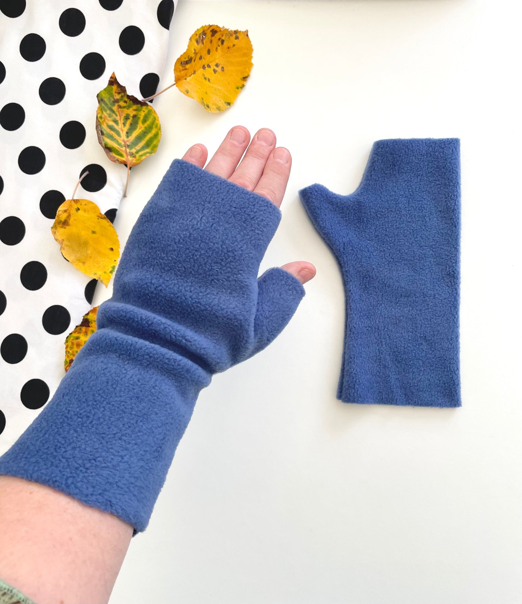 Fingerless denim blue fleece arm warmer gloves